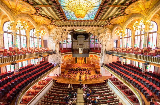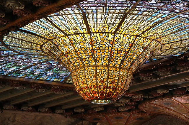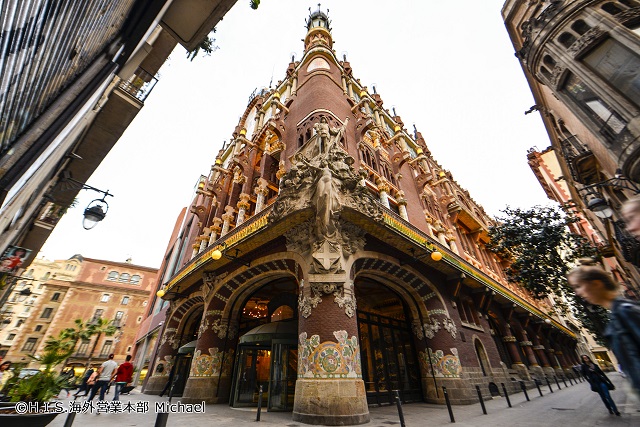 当時ガウディより人気だったモンタネールの最高傑作。建物内外の装飾はどれをとっても芸術!そして現役のコンサートホールでもあります。ため息が出るような天井のステンドグラス、アートの森のような柱など、フォトスポットが盛りだくさん。おさんぽ中に突然現れるこの建築物には目も心も奪われてしまいます。