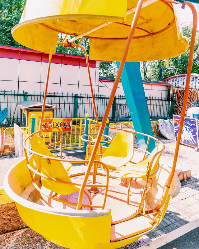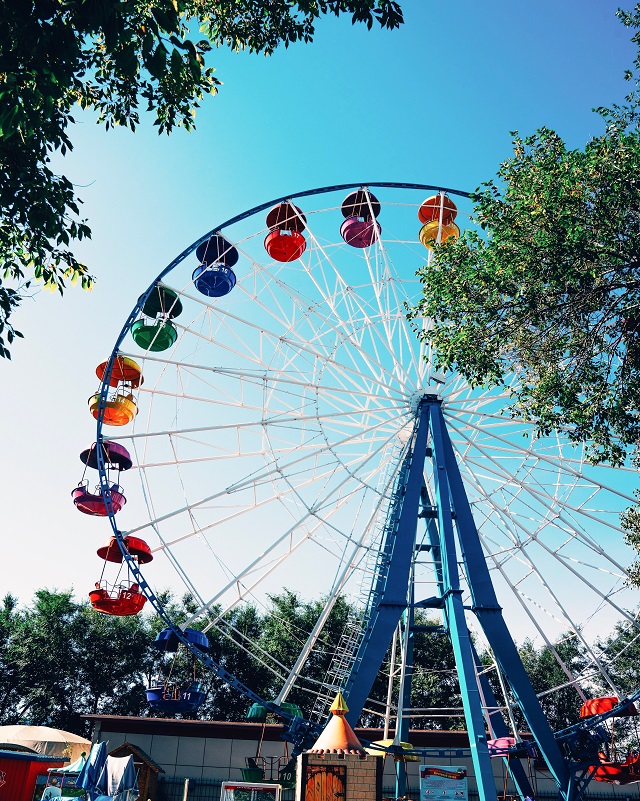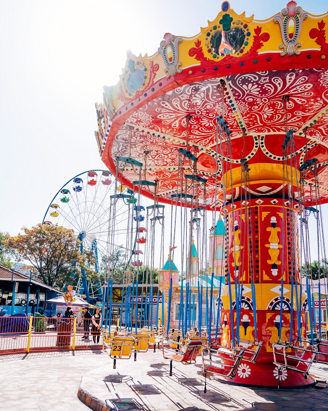キッズ用のかわいい遊具から、スリリングなバイキングなど、レトロかわいいアトラクションがある遊園地。