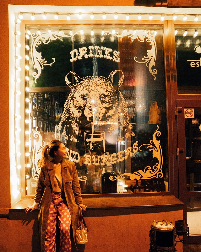 こちらのハンバーガーショップはクマがジュースを飲む姿とハンバーガーのプリントの外観がとってもかわいいんです!