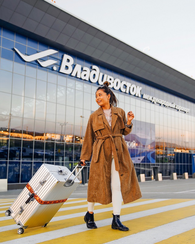 イエローとブルーがかわいいウラジオストク空港のエントランスでの撮影は外せません♡是非、お気に入りのトランクと一緒にウラジオストクのファーストフォトを撮りましょう。