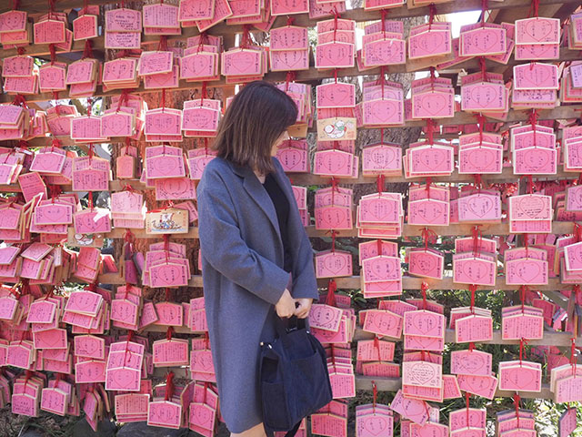 江島神社の辺津宮の絵馬は、ピンクの「恋むすび縁むすび絵馬」。 ハートの中に自分と相手の名前を書き込んで祈願する。 対象相手のいない人でも、良き人との出会いを期待して・・・。