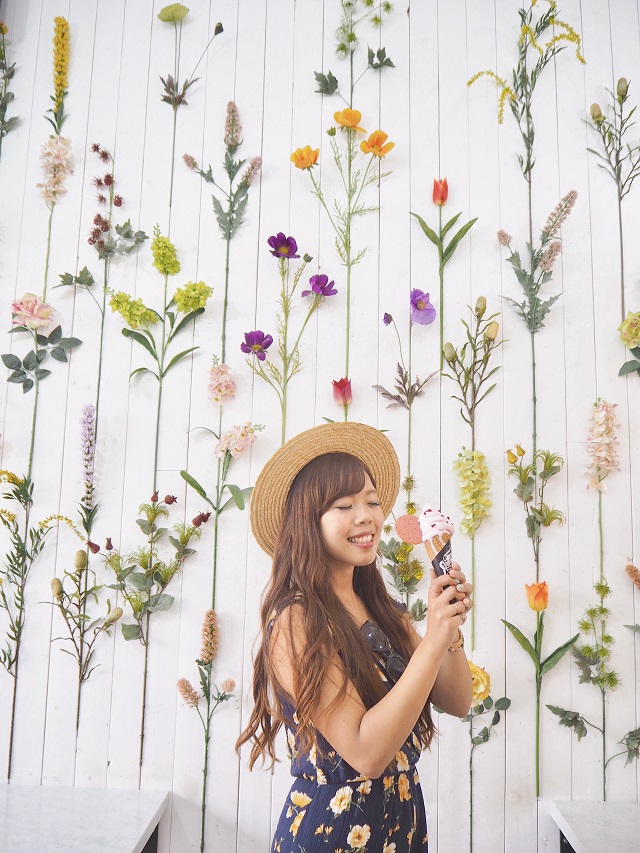 一面に飾ってある造花の可愛い壁が写真映え。台湾女子が集まる人気のお店です。