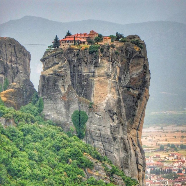 ギリシャのテッサリア地方ピンドス山脈の麓に、30m~400mの高さの岩の塔が60以上点在している「メテオラ」と呼ばれる地域があります。下界とは隔絶されたその岩の塔の頂上に、「メテオラ修道院」が建てられています。そそり立つ岩の塔に立つ修道院は、「メテオラ」(=現地の言葉で中空を表す)の名が示す通り、まるで空中に吊り下げられ、浮かんでいるかのように見えます。