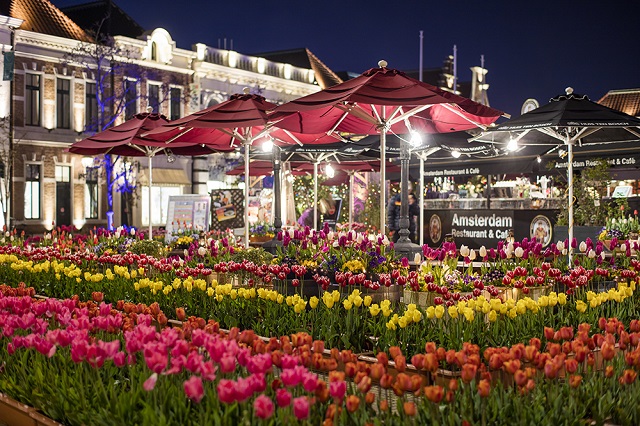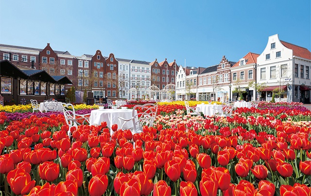 街の中心にあるアムステルダム広場では、色とりどりのチューリップと毎日開催される音楽コンサートが楽しめます♪
