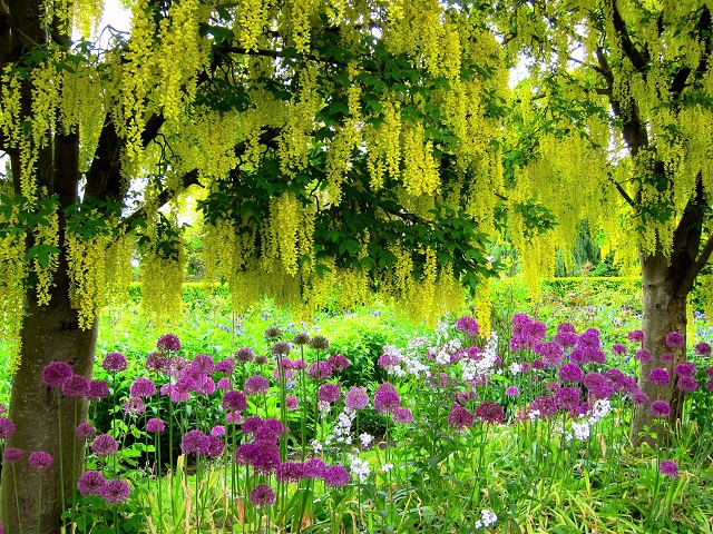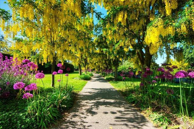 1番の見どころは、何と言ってもラバーナム・ウォーク!5月初旬から2~3週間だけ見られる満開の(和名)キバナフジが咲き乱れ、枝から垂れ下がる黄色い花をたくさんつけ、その下を歩きながら鑑賞することができます。