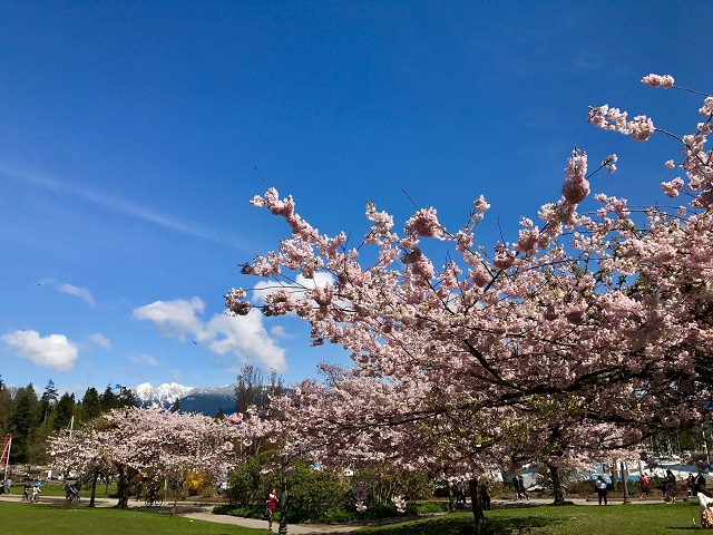 春の暖かい陽気のなか、サイクリングや散歩を楽しむ人々でいっぱいです。3月末からはスタンレーパークでは桜が咲き始め、桜の木下の芝生に座り、お花見を満喫することができます。桜並木をサイクリングするのもいいですね!