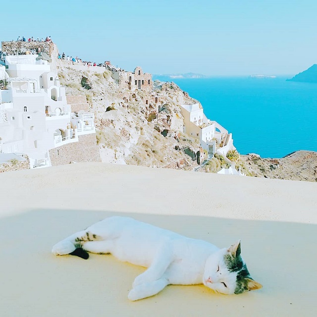 紀元前からの歴史と遺跡、火山活動が造りだした切り立った断崖の頂上に、積もった雪のように輝く白壁の家々。そこから見渡すエーゲ海に沈む夕日は心に刻まれる美しさです。エーゲ海を眺めながら、猫と過ごせるなんて、考えただけで癒されますね!