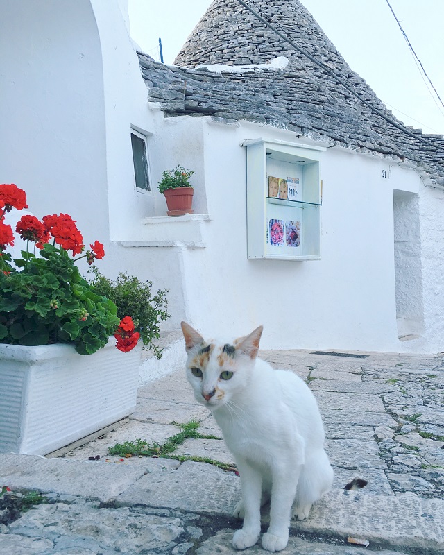 オリーブ畑が広がる南イタリアの農村地帯、約450m四方の土地に1,500軒ものとんがり屋根と白い壁の家が密集する街、アルベロベッロ。 これらはトゥルッリと呼ばれる、平たくした石灰岩を積み上げ、壁に石灰を塗った住居群。この地に移住してきた貧しい農民により16世紀半ば頃建てられた。納税を逃れるため、すぐに屋根を壊して「家ではない」と主張することができるよう、このような造りにしたという説が有力です。街歩きをしていると沢山の猫に出会えます♪