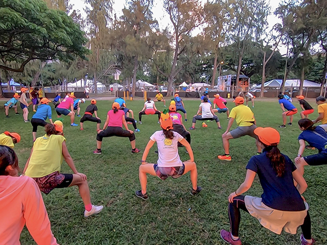 美味しいウニパスタの余韻が残りつつ向かうはカピオラニ公園。HISマラソンツアー専属コーチ陣によるジョグ&ストレッチに参加させていただきました。