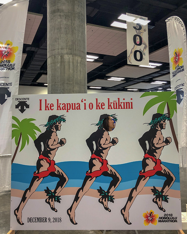 みんなと同様わたしたちも立ち止まって撮影タイム。ちょっと歩くとまた別のオブジェがあるので楽しみながら走れるのもホノルルマラソンならでは。