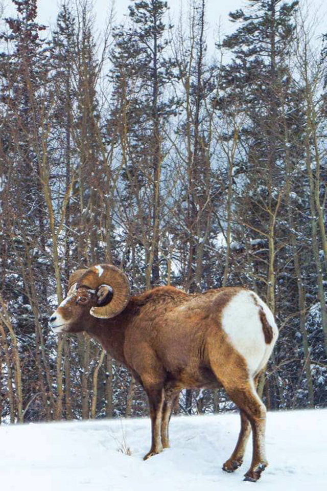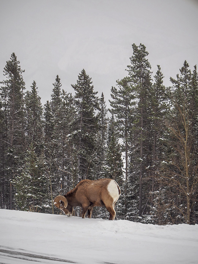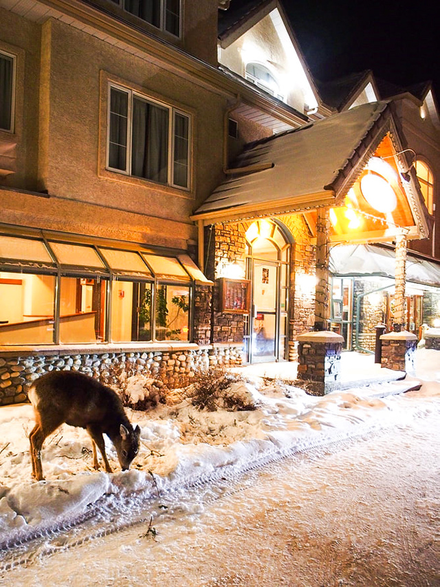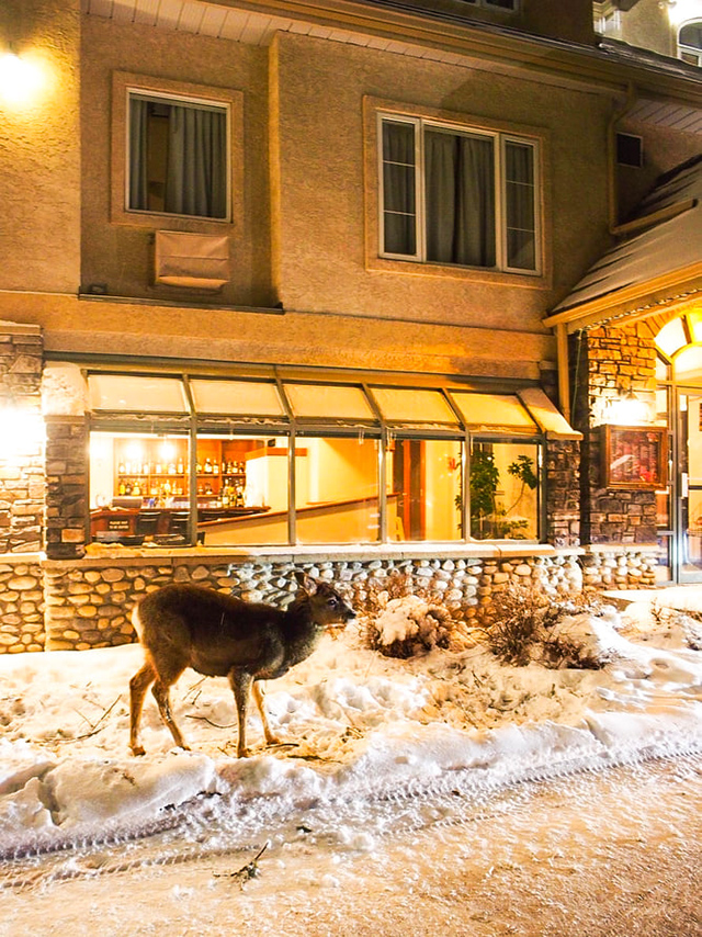 バンフは自然と動物と人が共存している街です。タウン内にもよく現れるというこのホワイトテールディア(鹿)も冬になると餌を求めに標高が低いところに現れるそうで、レストラン前でこんなに至近距離で見ることができましたよ!※あくまでも野生動物なのであまり近づきすぎないようにしてくださいね。