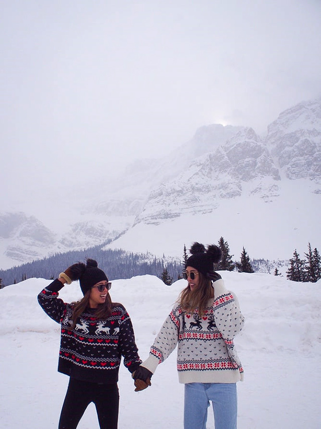 服装指数:-30℃。ここでは車をすぐ目の前に止めてもらって写真撮影ができたので、お揃いのセーターを見せたくて、せっかくなのでコートを脱いで撮影しました。ゆっくり外で氷河を見たい方は絶対にコート必須です(笑)ニット帽や手袋など肌を隠せるものは絶対にあった方がいいと思います。ホッカイロをたくさん張っておくといいと思います。