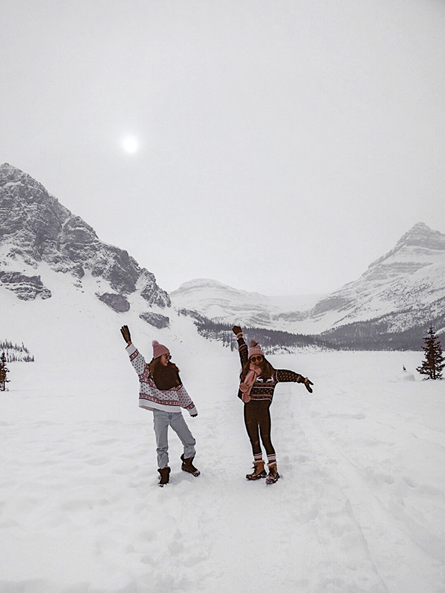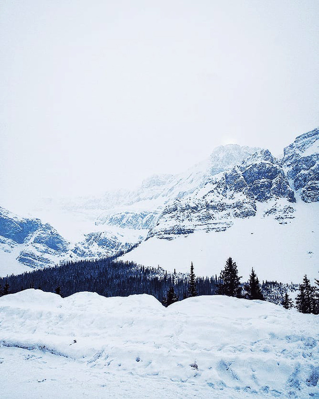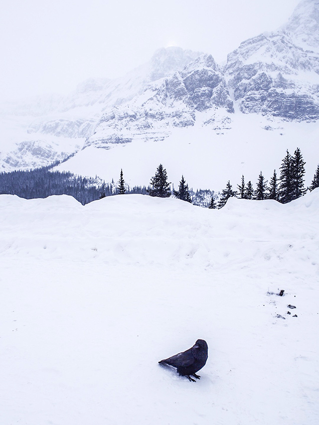 バンフの街から車で一時間ほどで着く、標高1920mに位置している氷河湖「ボウレイク」。なんとここは凍った湖の上!あまり観光客がいないので真っ白な世界で好きなだけ写真を撮るならここがおススメです!絵に描いたような雪の積もった山々が目の前に広がり、凍った湖の上にも雪が積もり、真っ白の銀世界が広がっていました。標高2000m級の山に囲まれて撮る写真は圧巻です。