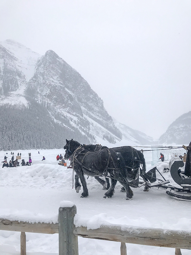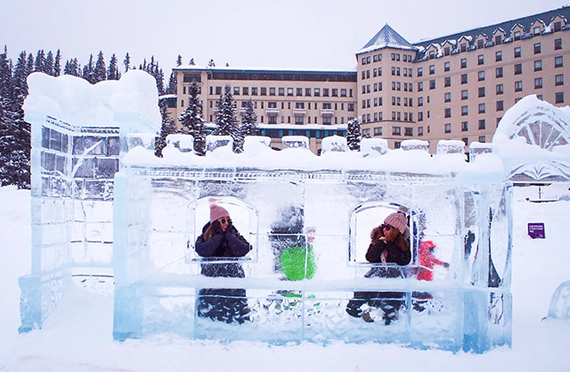 ボウレイクから車を走らせて30分。今までの雰囲気とガラリと変わり、たくさんの観光客でにぎわっているルイーズ湖。ここは大きなアトラクション施設のような場所です。凍ったレイクルイーズでスケートができたり、美しい氷の彫刻が展示されていたりと大人から子どもまで楽しめる場所です。