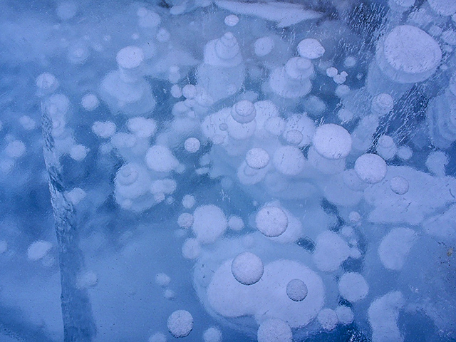 アイスバブルはなにかと言うと湖の奥深くに生息する植物のメタンガスによってできる泡のことで大きなバブルに火を付けると一瞬火柱を見ることもできるそうですよ!このアイスバブルが冬の凍ったアブラハム湖の氷の中に無数のクラゲのように何層にもなって現れ、何とも不思議な幻想的な世界を見せてくれます。