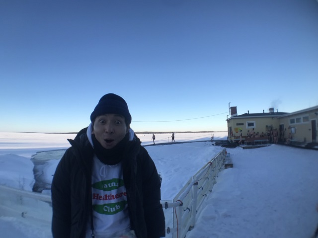 絶景のサウナを楽しみたいならぜひこの公衆サウナへ。桟橋の向こう側に見える白いところはすべて凍った湖です。