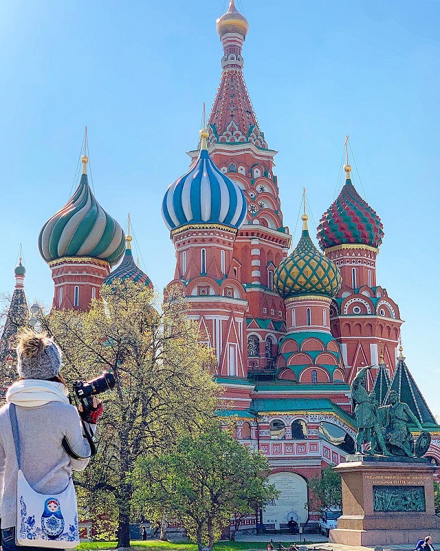モスクワ中央部,クレムリンの北東側の城壁に面した広場であり、赤の広場でひと際目を引くポクロフスキー聖堂はロシア正教を代表する教会のひとつ。たまねぎ形をしたカラフルな9つのかわいい屋根が特徴で、モスクワのシンボルにもなっています。写真提供:@mieamaさん