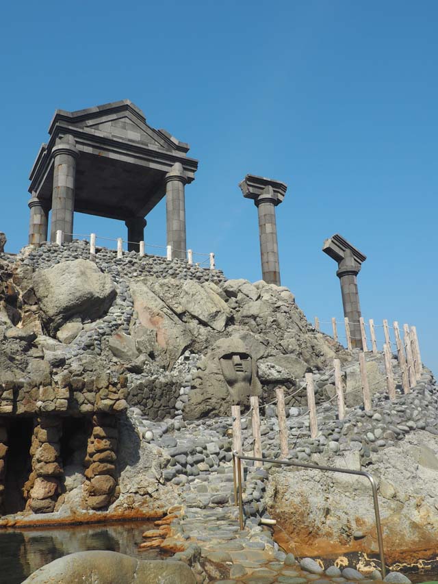 こちらは港から10分ほど歩いた距離にある露天風呂「湯の浜温泉」。古代ギリシャをモチーフにしたという建物がとても特徴的!