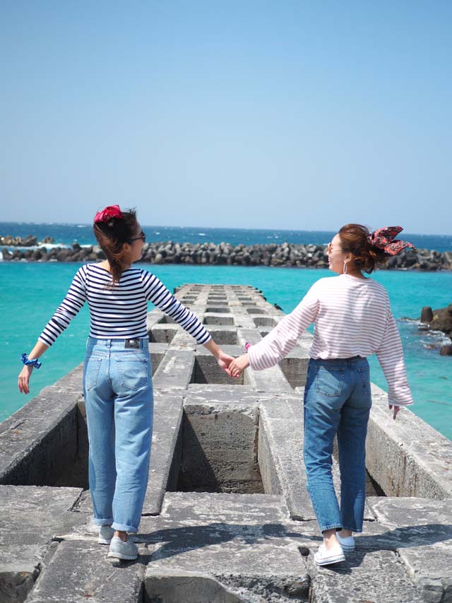 桟橋の上からのショットはこんな風に手つなぎショットで♡桟橋なので、高さがあるため穴が開いていると立っているだけでも少し危ないです。写真を撮る際は足元に気を付けてくださいね!
