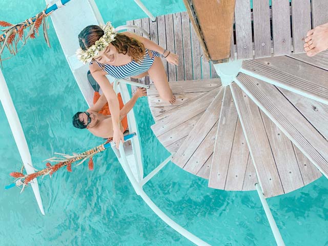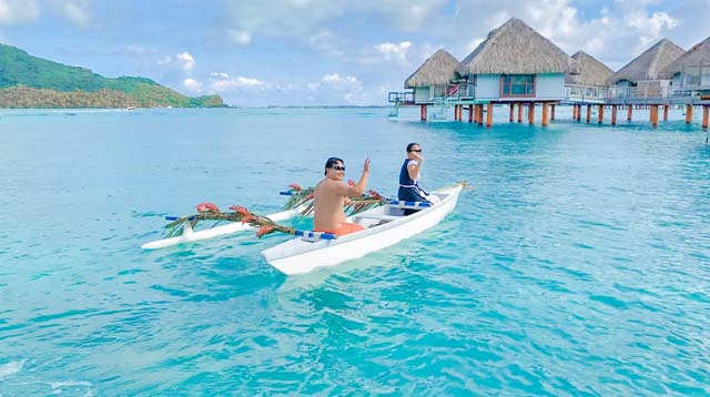 タヒチらしい南国の花や葉で飾ったカヌーに乗って朝食を届けてくれます。なかなかできない体験に驚きとワクワクの波が一気に押し寄せてきました。