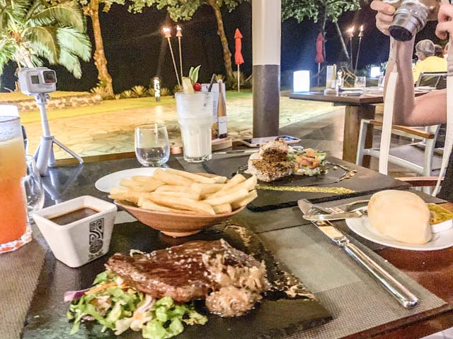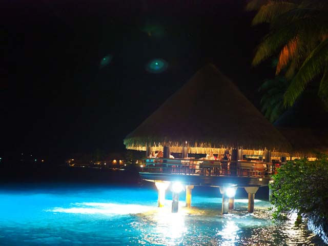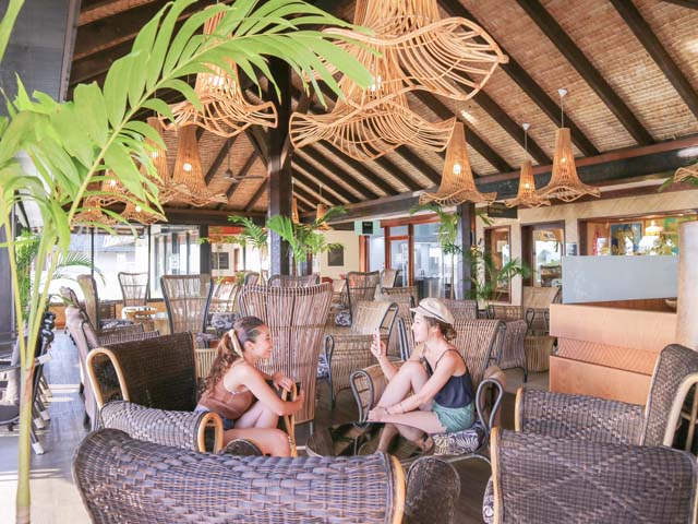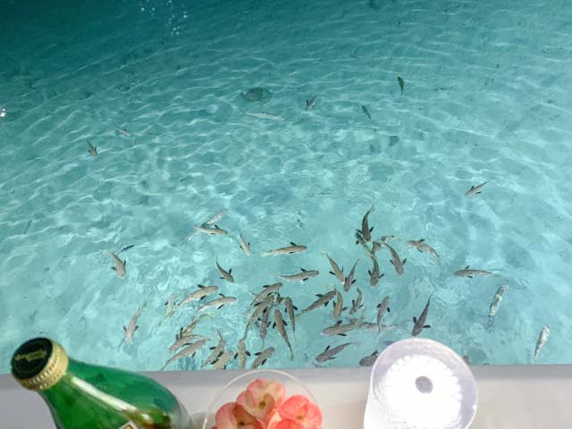 食事してるすぐそばにはラグーンが広がっていて、色々な種類のお魚を眺めながらの楽しいひとときを過ごすことができます。