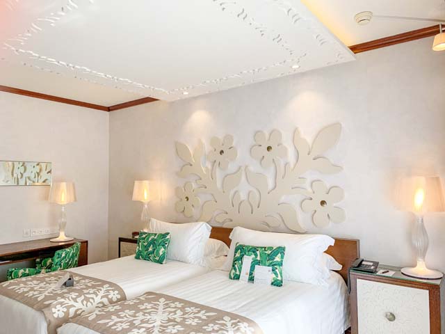 部屋は清潔感のある白を基調とし、タヒチの花ティアレをモチーフにした柄を壁やベッドスローに使用。