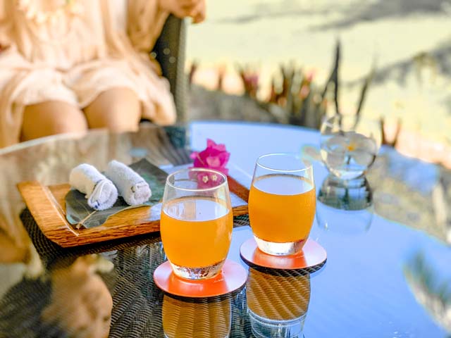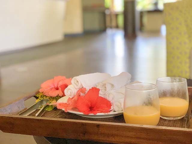 到着したらウェルカムサービス。お花の香りの冷たいおしぼりと、フルーツジュース。タヒチならではの細かな心遣いに感激。