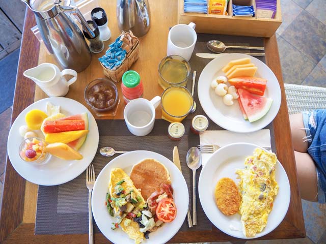 朝はブッフェ。シェフが目の前で焼いてくれるオムレツがふわふわ具沢山で絶品!私たちはミックスにしました。