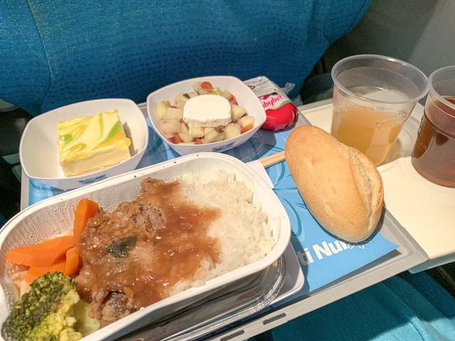 フライトしてしばらく経つといい香りがしてきます。肉と魚が選べて、肉料理ではご飯、魚料理にはうどんが添えられていました!