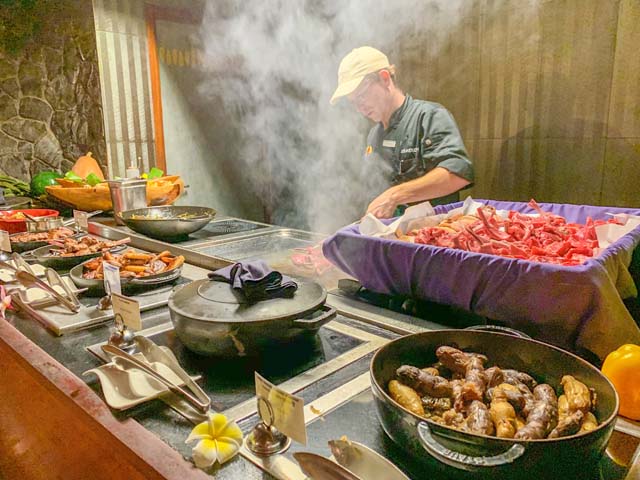 このように目の前でシェフが料理をしてくださいます。肉、魚、デザート、様々なご馳走があり世界の食事を堪能できます。