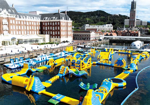 すべり台やトランポリン、シーソーなど50以上のアイテムで思いっきり楽しめる、日本最大級の海上アスレチック!体力の限界まで遊び尽くそう!