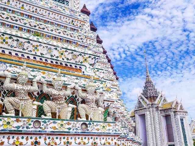 バンコクの有名な寺院の一つで、三島由紀夫の小説の舞台にもなった“暁の寺”「ワット・アルン」。“ワット”が寺、“アルン”が暁を意味します。色とりどりの5基の仏塔が特徴的です。夜にはライトアップもされるので、昼とは違った幻想的な雰囲気が楽しめます。