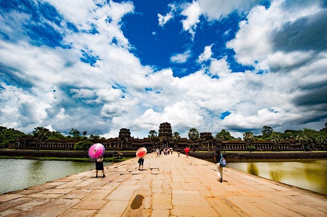 12世紀前半から30年かけて建造されたアンコール王朝を代表する遺跡。神々の住む山をイメージした中央祠堂を頂点にピラミッドのような形になっており、参拝者は神の世界にのぼっていくように造られています。各回廊の壁には、ヒンドゥー教や古代インドの叙事詩などが語られたレリーフがあり、その美しさは訪れる人々を魅了しつづけています。建物は真西を向いており、春分の日と秋分の日は、5つの尖塔の中央から日が昇ります。