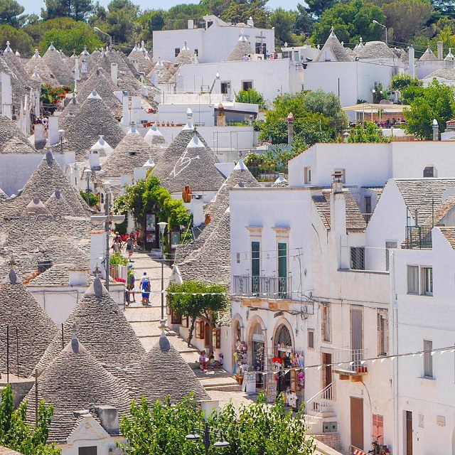 オリーブ畑が広がる南イタリアの農村地帯、約450m四方の土地に1500軒ものとんがり屋根と白い壁の家が密集する街、アルベロベッロ。これらはトゥルッリと呼ばれる、平たくした石灰岩を積み上げ、壁に石灰を塗った住居群。この地に移住してきた貧しい農民により16世紀半ば頃建てられた。納税を逃れるため、すぐに屋根を壊して「家ではない」と主張することができるよう、このような造りにしたという説が有力。一般の人が生活している住宅街でもあるので、観光の際は配慮を忘れずに。