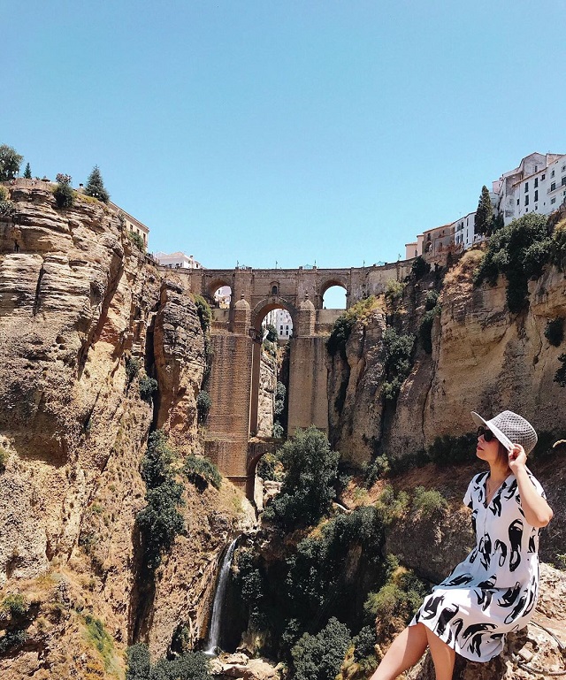 絶壁の白い村ロンダの旧市街と新市街を結ぶ橋。このフォトジェニは必ず撮ると決めていた!ツアーでロンダ回れる時間1時間半しかなくてどーやってこの場所にたどり着くのかもわからなくて迷った。横の方から崖を降りてくんだけどなかなか大変でした!!でもこの景色見れたし満足!!実はこの座っている岩の横は崖(^_^;)足少し震えてました。。後白のワンピースだったので撮影終わった後見たらお尻のところが土で汚れてとれなかった。。
