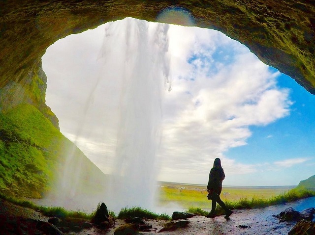 アイスランド南部のリングロード(国道1号線)近くにある滝、セリャラントスフォス。滝壺の壁側がくりぬかれたような形になっている為、滝の裏に回ることができます。青い空を背景に流れる滝を見ることができることで人気です。特に春には緑の大地に可愛らしい花が咲きます。夕方には夕陽に照らされたピンク色の滝が見られます。アイスランドといえばオーロラが観測できる事でも有名。運がよければオーロラと滝を同時に楽しむ事もできます。