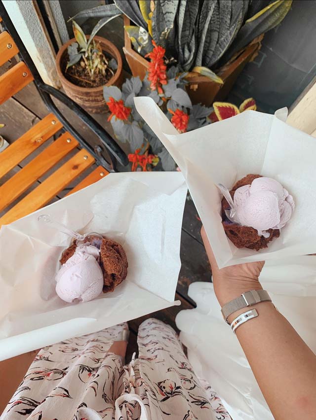 出来立て熱々のサーターアンダギーに冷たいアイスクリームが絶品です!私は紅芋のサーターアンダギーと紅芋のブルーシールの組み合わせにしました!常温で3日保つそうなのでお土産にもピッタリですね。