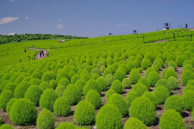 茨城県ひたちなか市にある国営公園、ひたち海浜公園は敷地面積200ヘクタールと広大で、四季折々に咲き誇る花々を楽しむ事ができます。初夏に青の花を咲かせるネモフィラと並んで、特に人気なのがコキア(ほうき草)です。約3.5ヘクタールの『みはらしの丘』をコキアが真っ赤に染め上げます。8月~9月には緑色のコキアが、秋の訪れと共に真っ赤に色づくのです。ふわふわ、もこもこした形がなんとも愛らしい景色が広がります。
