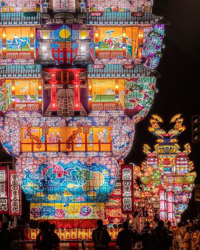 能代に続く歴史ある行事「能代七夕」。巨大な鯱を冠した城郭型の灯籠を引き回し、まち中を練り歩きます。灯籠は格段ごとに名称が異なり、さまざまな歴史的描写を映し出しています。