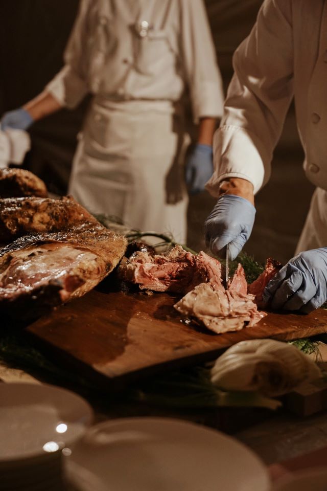 焼き立ての北海道産牛肉、ラム、豚と贅沢にお肉をフルコースで堪能!シェフが目の前で豪華にカットしてくださるパフォーマンスも!