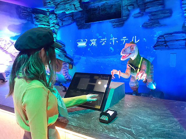 恐竜さんたちがお出迎えしてくれ、タッチパネルでスムーズにチェックイン。