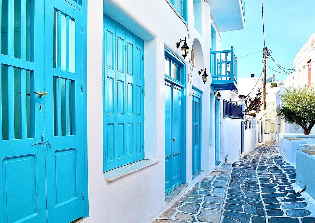 青い屋根・白い壁が有名なミコノス島は窓も扉も青いんですね。