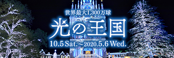 1,300万球の光が輝くイルミネーション「光の王国」。これからの季節は花と光のコラボレーションも見どころです!