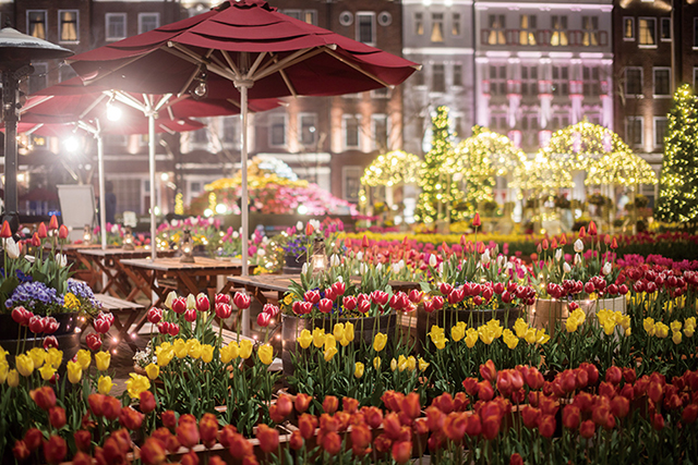 場内中央に位置するアムステルダム広場は四季の花の移ろいを感じることができる「華やかに彩られた広場でのんびり過ごしていると、