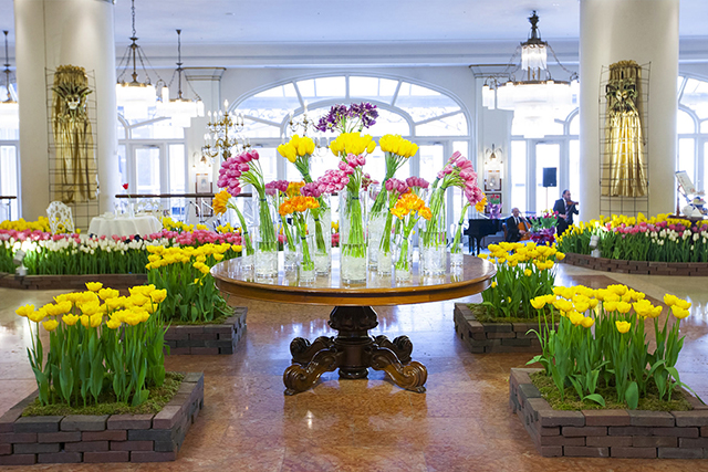クラシカルな雰囲気漂うホテルヨーロッパのロビーも、フラワーモチーフのお部屋に泊まってお花に包まれた特別な夜を過
