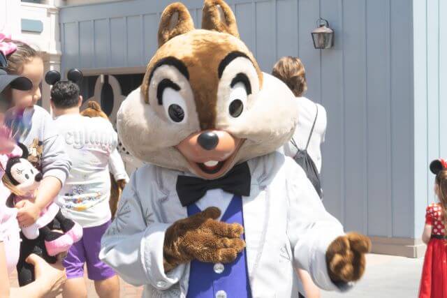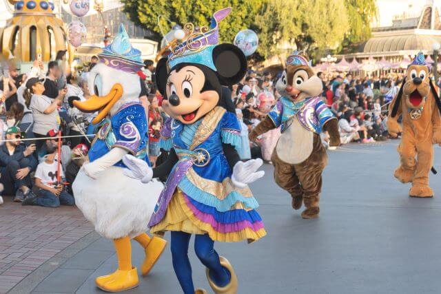 お昼過ぎ頃の時間になると、メインストリートにディズニー100のセレブレーションのコスチュームを着た仲間たちが登場!