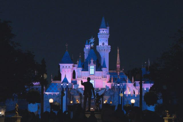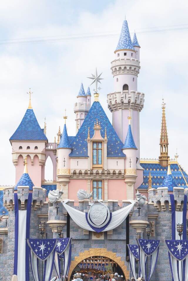 カリフォルニア ディズニーランド・リゾートのお城は、眠れる森の美女 オーロラ姫のお城。よ〜く見てみると、魔法使いの妖精たちがお城全体をプラチナカラーのキラキラで装飾しています♡