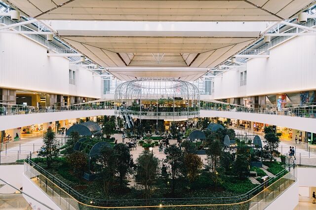 近代的な建物からは、想像できないようなボタニカルな屋内庭園。3階から1 階にかけて流れる滝「ウォーターホールガーデン」は圧巻。スタイリッシュさと自然が見事に融合している空間は、とっても心地良い。