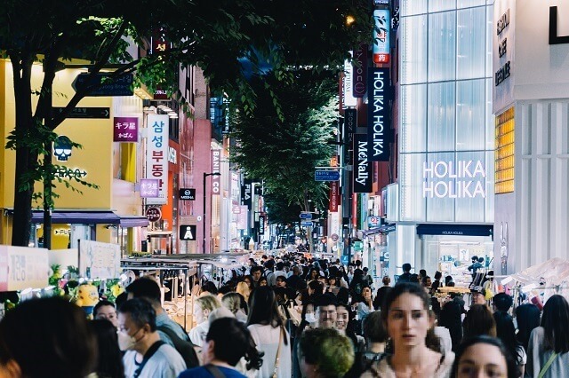 ソウル最大の繁華街「明洞(ミョンドン)」。たくさんの観光客で賑わっていて、屋台なども立ち並び、歩いているだけでソウルの活気を感じられる場所。
