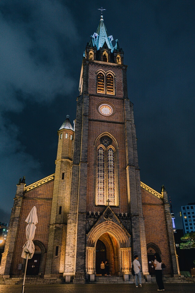 明洞の華やかな空気感とは打って変わって、厳かで静かな雰囲気の夜の聖堂も人気のスポット。明洞に来た際に訪れてみては。